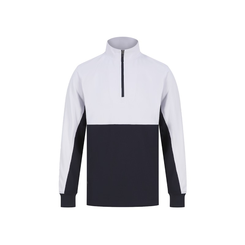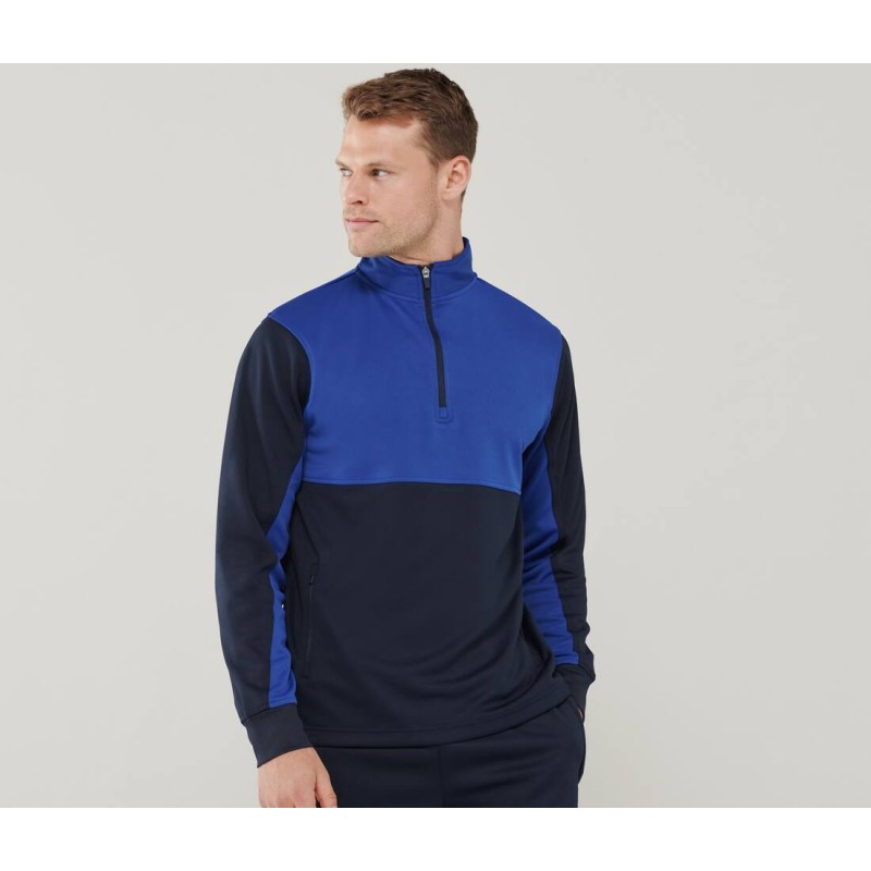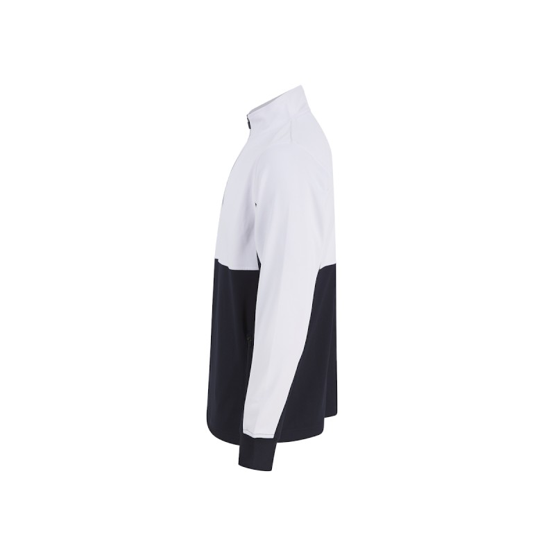 Col zippé. Panneaux de couleur contrastée sur les manches. Blanc adapté à l'impression par sublimation. Intérieur gratté.